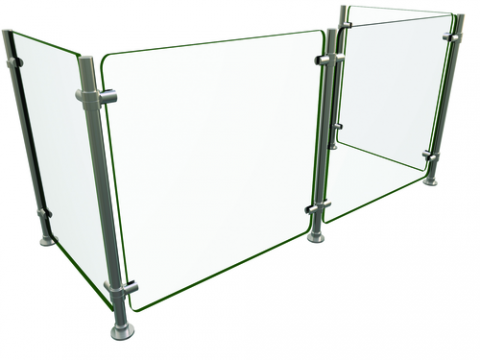 Flav-R-Shield® EP5-RING Food Shield, full service pass-over, 2 Bays 48"W x 18"D x 25"H, heat tempered glass construction throughout with 3/4" radius corners and polished edges, 1/4" thick glass front and side panels, 1" OD brushed 304 stainless steel posts, adjustable ring brackets with locking points every 15 degrees, 2 x 18" deep glass end panels, NSF component, Made in the USA