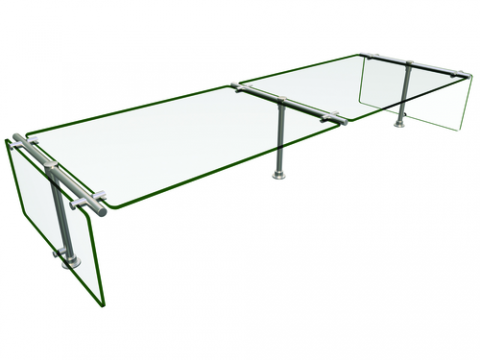 Flav-R-Shield® ES53 Food Shield, stationary double-sided self service, 2 Bays 60"W x 20"D x adjustable up to 54"H, heat tempered glass construction throughout with 3/4" radius corners and polished edges, 3/8" thick glass top shelf and end panels, 1" OD brushed 304 stainless steel posts, NSF component, Made in the USA