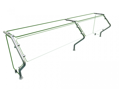 Flav-R-Shield® ES73 Food Shield, self service, 2 Bays 84"W x 19"D x 24"H, heat tempered glass construction throughout with 3/4" radius corners and polished edges, 1/4" thick glass top shelf, glass front and end panels, 1" OD brushed 304 stainless steel posts, NSF component, Made in the USA