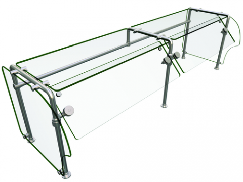 Flav-R-Shield® ES90 Food Shield, self-service, 72"W x 24"D x 22.63"H, heat tempered glass construction throughout with 3/4" radius corners and polished edges, 3/8" thick glass top shelf, adjustable front panel and side panels, 1" OD brushed 304 stainless steel posts, NSF component, Made in the USA
