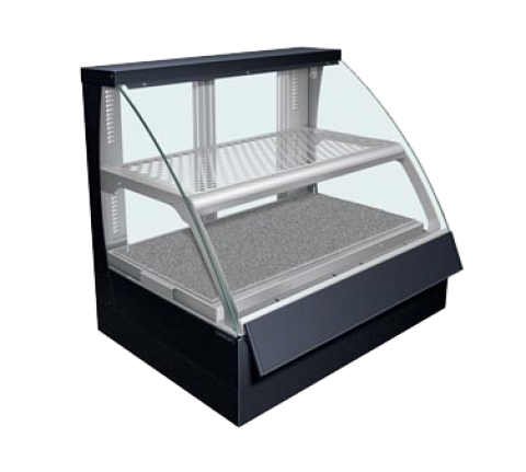 Flav-R-Savor® Heated Display Case, Curved Glass, countertop design, (2) pan double shelf, perforated top shelf, heated Swanstone® simulated stone base shelf, usable shelf dimensions: upper 31.75"W x 16"D - lower 32.25"W x 19.75", convected air, lighting, hinged tempered front glass panel, digital display, rear glass doors, stainless steel interior, sign holder, 1800 watts, cULus, UL EPH Classified, Made in USA