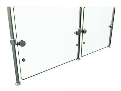 Flav-R-Shield® ORBIT100 Food Shield, full service pass-over, 2 Bays 60"W x 2"D x 18"H, heat tempered glass construction throughout with 3/4" radius corners and polished edges, adjustable 3/8" thick front panel with roatating face panel and additional circular openings for optimum high adjustment, 1" OD brushed 304 stainless steel posts with mounting feet, NSF component, Made in the USA