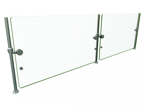Flav-R-Shield® ORBIT100 Food Shield, full service pass-over, 2 Bays 84"W x 2"D x 18"H, heat tempered glass construction throughout with 3/4" radius corners and polished edges, adjustable 3/8" thick front panel with roatating face panel and additional circular openings for optimum high adjustment, 1" OD brushed 304 stainless steel posts with mounting feet, NSF component, Made in the USA