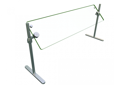Flav-R-Shield® ORBIT720 portable Food Shield, self-service, 48"W x 14"D x 23"H, heat tempered glass construction throughout with 3/4" radius corners and polished edges, adjustable 3/8" thick front panel, 1" OD brushed 304 stainless steel posts with mounting feet, NSF component, Made in the USA