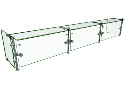 Flav-R-Shield® ORBIT900 Food Shield, full service, 3 Bays 108"W x 24"D x adjustable up to 23"H, 3/8" thick heat tempered glass construction throughout with 3/4" radius corners and polished edges, glass top shelf, front and side panels, 1" OD brushed 304 stainless steel posts, NSF component, Made in the USA