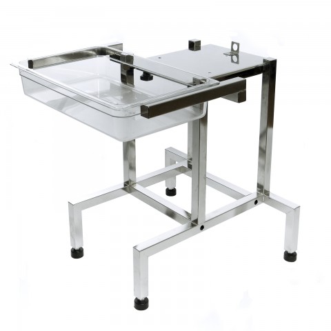 Food Processor Stand, mounts an FP100, FP150, FP250, or FP350 machine, holds PLASTIC-PAN accessory to receive processed product, tray arms are removable for use with PRODUCT-CART accessory, (plastic tray included)
