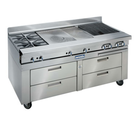 Spec Series Sizzle 'N Chill System, 72", (4) drawers, (8) pan capacity, digital thermostat, designed for remote refrigeration, front mount thermostat, includes drawer dividers, stainless steel front, drawer fronts, sides, guides & bearings, 6" legs, 120v/60/1-ph, 1/5 HP, 6' cord & plug, 3.0 amps, cETLus, ETL-Sanitation