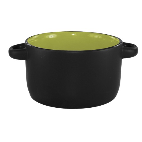 Bistro Soup Bowl, 11 oz., 4-1/8" dia. (w/handles 5-5/8" dia.) x 2-3/8"H, round, oven/microwave/dishwasher safe, lead free, fully vitrified, stoneware, black matte exterior, rye green interior, Hilo®
