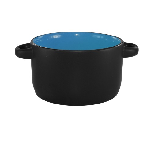 Bistro Soup Bowl, 11 oz., 4-1/8" dia. (w/handles 5-5/8" dia.) x 2-3/8"H, round, oven/microwave/dishwasher safe, lead free, fully vitrified, stoneware, black matte exterior, sky blue interior, Hilo®