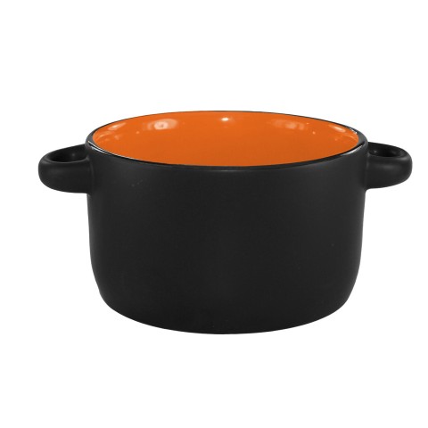 Bistro Soup Bowl, 11 oz., 4-1/8" dia. (w/handles 5-5/8" dia.) x 2-3/8"H, round, oven/microwave/dishwasher safe, lead free, fully vitrified, stoneware, black matte exterior, orange interior, Hilo®