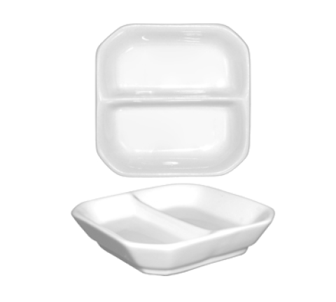 Compartment Sauce Dish, 2-1/2 oz. per well, 5" x 5" x 1"H, 2-compartment, square, fully vitrified, microwave & dishwasher safe, lead free, porcelain, Bright White