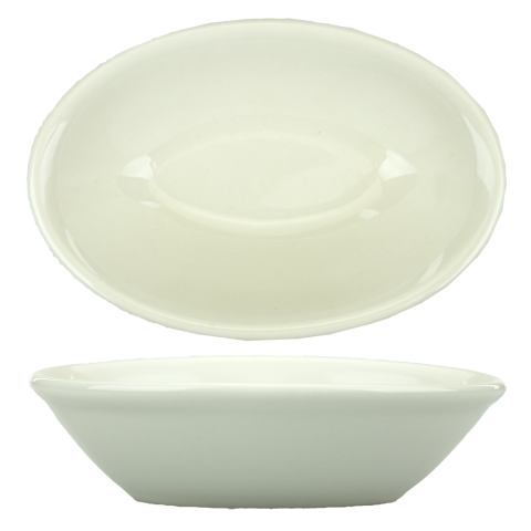 Sauce Dish, 4 oz., 5" x 3-5/8", oval, rolled edge, microwave & dishwasher safe, lead free, ceramic, American White, Roma™