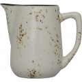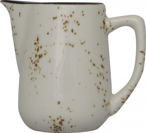 Creamer, 4"D with handle x 3-3/8"H 5 oz., Round with Handle & Spout, Stoneware Fully Vitrified with hand painted reactive glaze finish, Crème with Dark Brown Trim and Speckles, Splash™