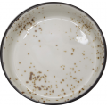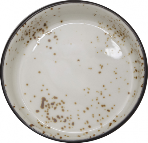 Sauce Dish, 3-1/8"D x 3/4"H, 2 oz., Round, Stoneware Fully Vitrified with hand painted reactive glaze finish, Crème with Dark Brown Trim and Speckles, Splash™
