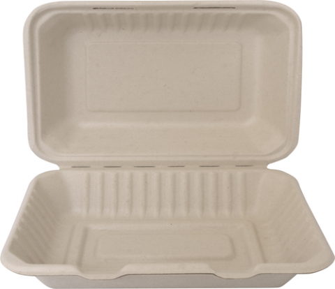 Container, Sugar Cane, natural, hinged lid, rectangular, 1-Compartment, 9”L x 6-3/4”W x 3”H, microwave safe (200 each per case) (Promotional NET price, effective 09/01/2025)