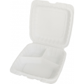 Container, Plastic, white, square, hinged lid, 3-Compartment, Microwavable, dual bar locks, non-absorbent, 9" x 9" x 3", 60g (150 each per case) (Promotional NET price, effective 09/01/2025)