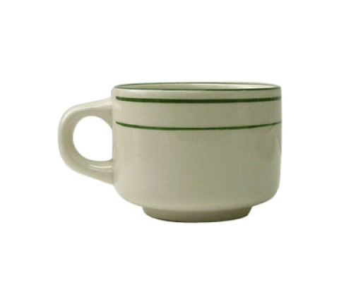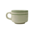 Cup, 7 oz., 3-1/4" dia. x 2-1/2"H, round, stackable, with handle, microwave & dishwasher safe, lead free, ceramic, American White with green band, Verona™