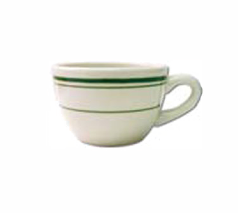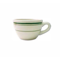 Cup, 8 oz., 3-7/8" dia. x 2-1/2"H, low, round, with handle, microwave & dishwasher safe, lead free, ceramic, American White with green band, Verona™
