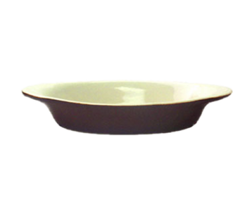 Welsh Rarebit, 8 oz., 8-1/2" x 4-1/8" x 1-1/4"H, oval, two-tone, with handles, fully vitrified, oven/microwave/dishwasher safe, oven safe to 450°F, lead free, stoneware, American White inside/caramel outside