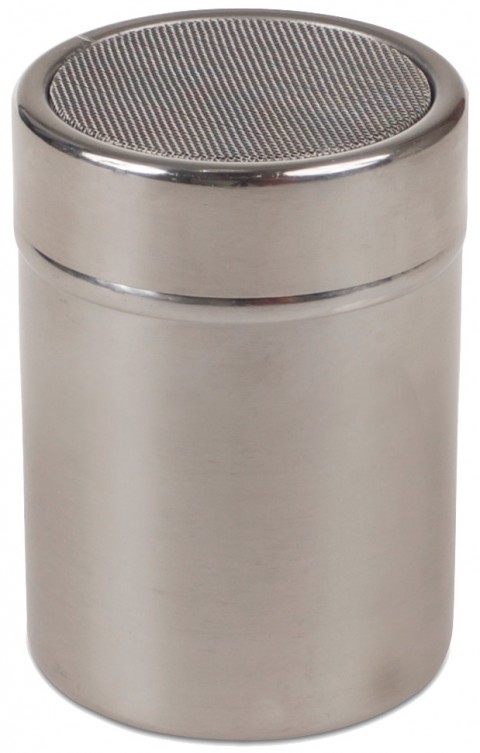 Shaker, 8 oz. capacity, 3-3/4"H, for powdered sugar, pressure hold cap, mesh lid, stainless steel