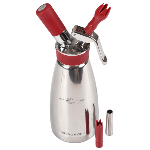 iSi Thermo Whip Cream Maker, 14"H, 16 oz. capacity, included: (1) cleaning brush and 3 decorating tips (1) tulip tip (1) straight tip and (1) star tip, rust proof, heat resistant, double-wall vacuum insulation, dishwasher safe, silicone grip, stainless steel, NSF, HACCP compliant, Made in Austria