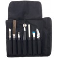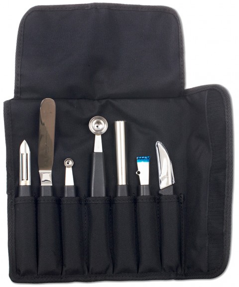 Garde Manger Set, includes: mini vegetable scoop (10mm), butter curler, double vegetable scoop (22mm and 25mm), apple corer, lemon zester, and lemon decorator, stainless steel pieces with black handles, black nylon rol
