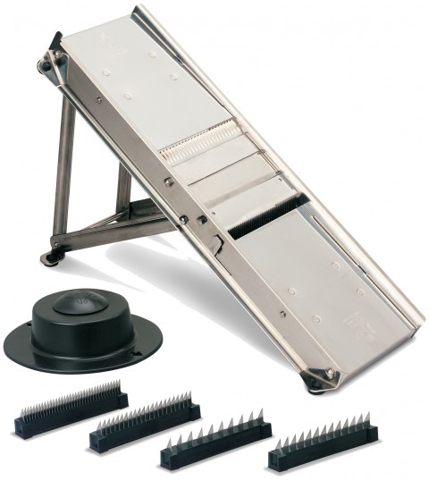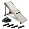 Bron Super Pro Mandoline, 5-1/4" x 16"L (5) interchangeable blades with 1mm 2mm 4mm 7mm and 10mm spacing, plastic protector, slip resistant rubber feet, stainless steel