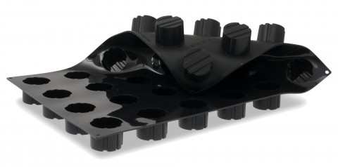 Pavoni Pavoflex Mold, 23-1/2"L x 15-3/4"W, (25) ridged cylinder, 2-2/5" dia. x 1-3/4"H with 7/8 oz. capacity each, temperature range -40 to 536°F, non-stick, flexible, silicone, black