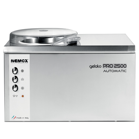 Nemox Gelato Pro 2500 Auto, 17-7/10"W x 12-3/5"D x 15-1/5"H, air cooled, 20-30 minutes production time, makes 3 qt. per hour, adjustable scrapers, stainless steel construction, 120v/60/1-ph, 280watts, USA 15 amp outlet