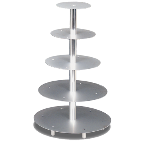 Wedding Cake Stand, 30"H overall, (5) tiers sizes: 8" 10" 12" 16" and 18", round, anodized aluminum plates, chromed steel posts