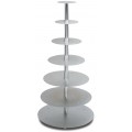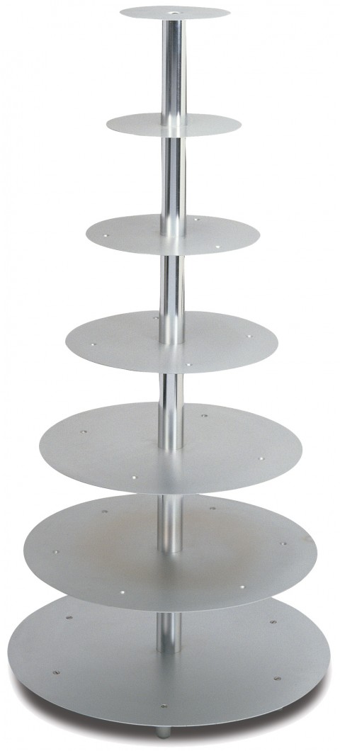 Wedding Cake Stand, 44"H overall, (7) tiers sizes: 6" 8" 10" 12" 16" 18" and 20", round, anodized aluminum plates, chromed steel posts