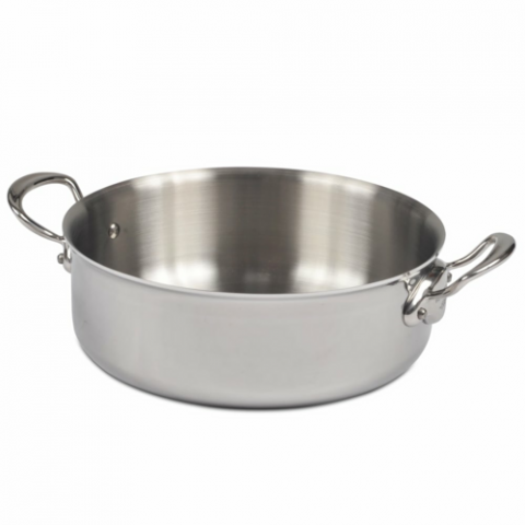 Mauviel M'Cook Rondeau Pan, 15.8 qt. 11" dia. x 4"H, round, non-drip edge, riveted cast stainless steel stay-cool handle, non-corrosive, oven safe to 680°F, gas/electric/halogen/induction/oven, 5-ply 18/10 stainless steel, polished finish