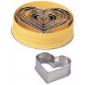 Pastry Cutter Set, 1-1/8"H, cut size range 1-1/4"W to 5-1/2"W, heart shaped, stainless steel, yellow plastic box (7 pieces per set)