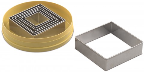 Pastry Cutter Set, cut size range 1-1/2"L to 4"L, square, stainless steel, yellow plastic box (7 pieces per set)