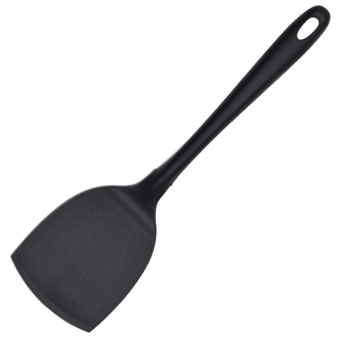 Spatula, 14" overall, 3-3/4" x 4-1/4"L blade, solid, rounded, heat resistant up to 428°F (220°C), ergonomic handle, hanging hole, nylon, black