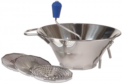 French Food Mill, 5 qt., 12" dia., includes (3) disc-shaped graters 1.5mm 2.5mm and 4.0mm holes, double pulping area, processes 3.30 lbs. per minute, stainless steel