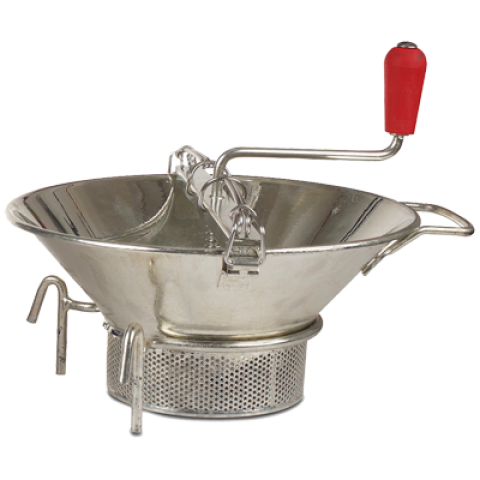 French Food Mill, 8 qt., 14" dia., includes (1) sieve with 3.0mm holes, double pulping area, processes 10 lbs. per minute, tinned steel