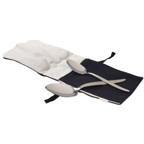 Gray Kunz Spoon Set, 2-piece, includes (1) 9" and (1) 7-1/2" solid serving spoons, comes with a 3 pocket canvas roll (9" x 3"), 18/10 stainless steel