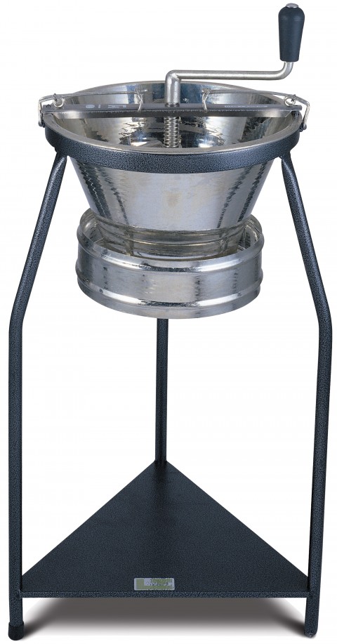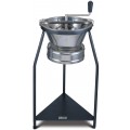Food Mill And Stand, 15 quarts capacity, 30"H overall, includes (1) sieve with 3.0mm holes, processes 22 lbs. per minute, tinned steel mill, steel stand, black