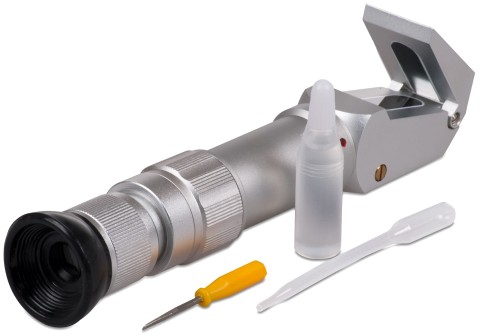 Sugar Density Refractometer, 7"L x 1-1/4"W, full range, uses 0-80 brix scale, measures the concentration of sugar, stainless steel
