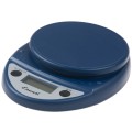 Escali Scale, 8"L x 6"W x 1-1/4"H overall, 6" round platform, 11 lbs. (5000 gram) capacity, measures in 0.1 ounce (1 gram) increments, compact, portable, digital, tare feature for resetting the scale back to zero, contents feature, automatic shut-off, (2) AA batteries (included), plastic, blue