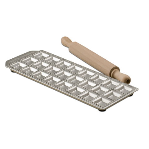 Ravioli Mold, 11-1/4"L x 4"W, (24) cavities, includes (1) wood rolling pin, rubber feet, aluminum