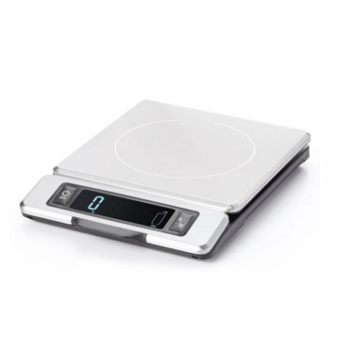 OXO 11lb Scale with Pull-Out Display, 7"W x 10"D x 3"H, 11lbs capacity, measures in 0.1-oz (US) and 1-g (metric) increments, stainless steel