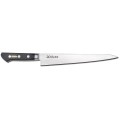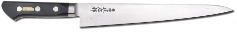 Masahiro Slicer (Sujihiki), 9-1/2", forged, smooth edge, carbon steel blade, plastic handle, black, Made in Japan