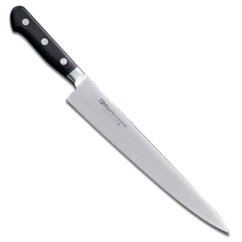Misono Chef's Slicer, 9-1/2"L, forged, high carbon stainless steel blade, wood handle, black