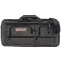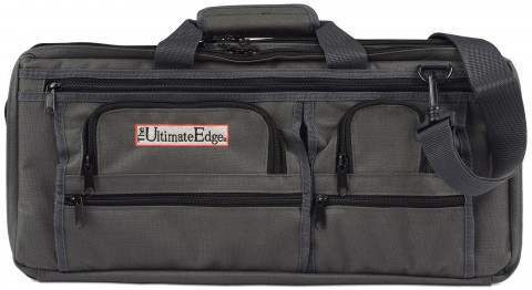 Deluxe Knife Bag, 3-section, 20" x 9"H, holds up to 18 knives, 5 exterior pockets, interior mesh pocket, padded carry handle, includes shoulder strap, PVC laminated polyester, graphite gray
