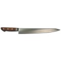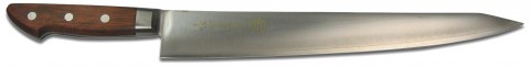 Kikuichi Chef Slicer, 10-1/2", forged, smooth edge, high stainless steel blade, wood handle, Rosewood handle, Made in Japan
