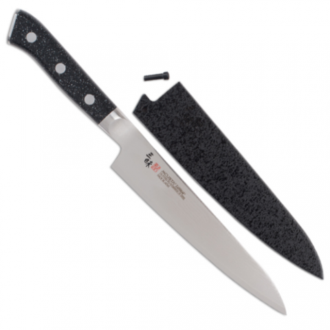 Zanmai Pro Damascus SE Petty 5.9-in with Black Lacquer Saya Cover, stainless steel and corian