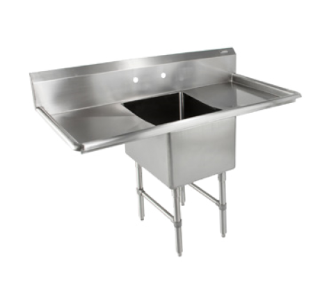"B" Series Sink, 1-compartment, 55"W x 25-1/2"D x 44"H overall size, (1) 16"W x 20" front-to-back x 14" deep compartment, (2) 18" left & right drainboards, 10"H boxed backsplash with 45° top and 2" return, (1) set of splash mount faucet holes with 8" centers, 3-1/2" die-stamped drain opening, 16/300 stainless steel construction, stainless steel legs, adjustable side bracing, adjustable bullet feet, NSF, CSA-Sanitation (Available in Effingham and Nevada)