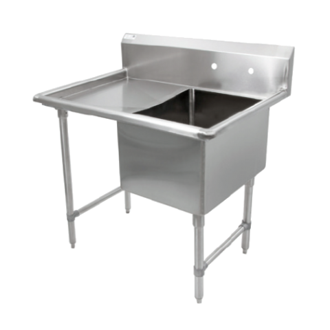 "B" Series Sink, 1-compartment, 40"W x 29-1/2"D x 44"H overall size, (1) 18"W x 24" front-to-back x 14" deep compartment, (1) 18" left drainboard, 10"H boxed backsplash with 45° top and 2" return, (1) set of splash mount faucet holes with 8" centers, 3-1/2" die-stamped drain opening, 16/300 stainless steel construction, stainless steel legs, adjustable side bracing, adjustable bullet feet, NSF, CSA-Sanitation